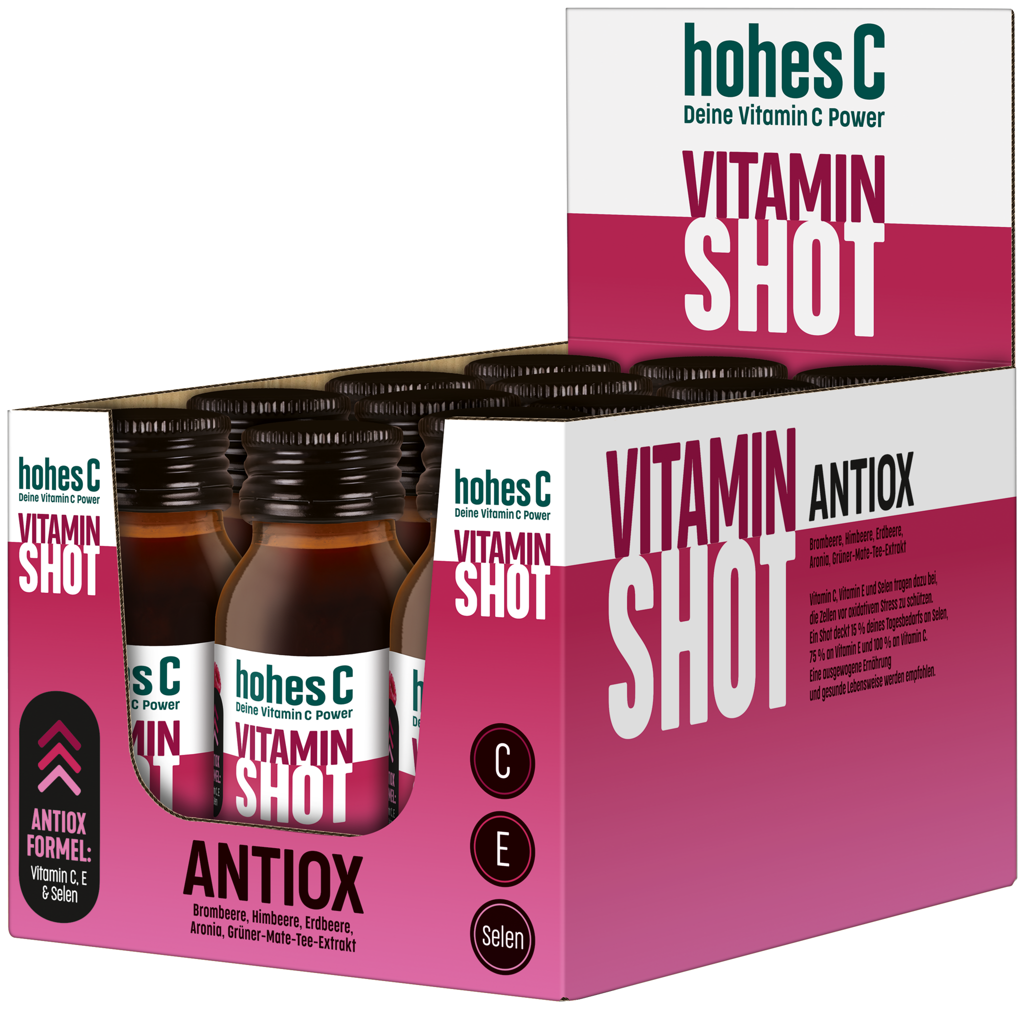 hohes C Vitamin Shots Antiox sind dein leckerer Kickstart für jeden Tag. Ideal, um dir und deiner Gesundheit schnell und unkompliziert etwas Gutes zu tun. Die unvergleichliche Mischung aus Brombeere, Himbeere und Erdbeere plus Aronia & Grüner Mate Tee-Extrakt sorgt für ein süßes, fein-herbes Geschmackserlebnis. Ein Shot deckt deinen Tagesbedarf an natürlichem Vitamin C zu 100%, Vitamin E zu 75% und Selen zu 15%. Diese tragen zum Schutz der Zellen vor oxidativem Stress bei - eine ausgewogene Ernährung und gesunde Lebensweise werden empfohlen.