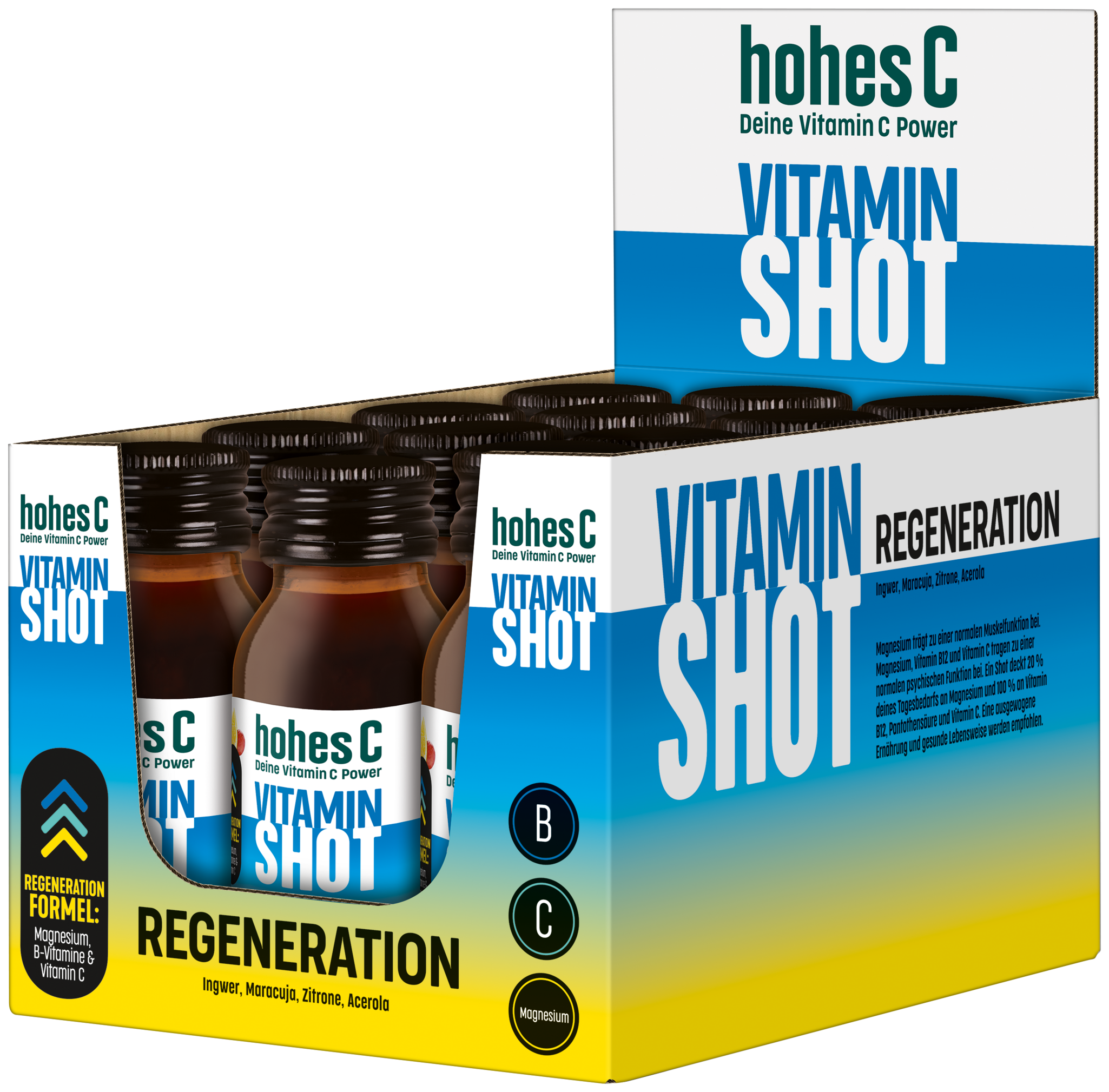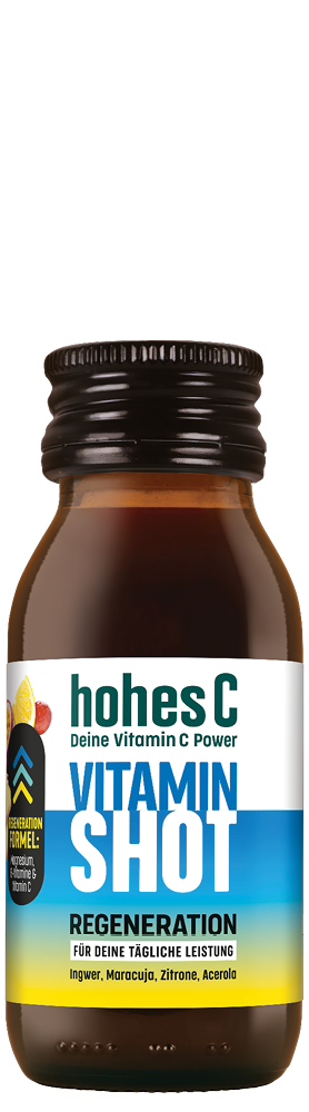Leistungsstark durch den Alltag mit den hohes C Vitamin Shots Regeneration. Die leckere Kombination aus Ingwer, Maracuja, Zitrone und Acerola ist ideal für deine tägliche Leistung. Eine Tagesportion deckt bereits 20% deines Tagesbedarfs an Magnesium und sogar 100% an Vitamin B12, Pantothensäure und natürlichem Vitamin C. Magnesium trägt zu einer normalen Muskelfunktion bei. Magnesium, Vitamin B12 und Vitamin C tragen zu einer normalen psychischen Funktion bei. Eine ausgewogene Ernährung und gesunde Lebensweise werden empfohlen.
